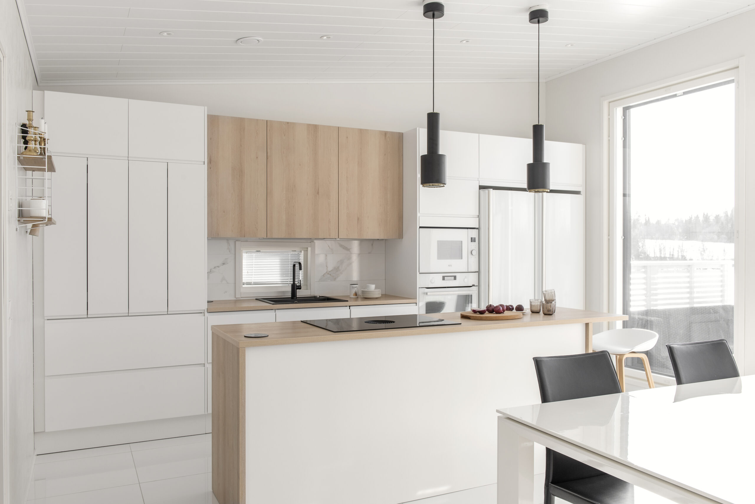 Valkoinen on keittiön ajaton klassikko, joka toimii yksin tai parina toisen sävyn kanssa. Tässä kokonaisuudessa valkoinen yhdistyy lämpimään rantapyökin sävyyn, mikä luo raikkaan ja harmonisen ilmeen.