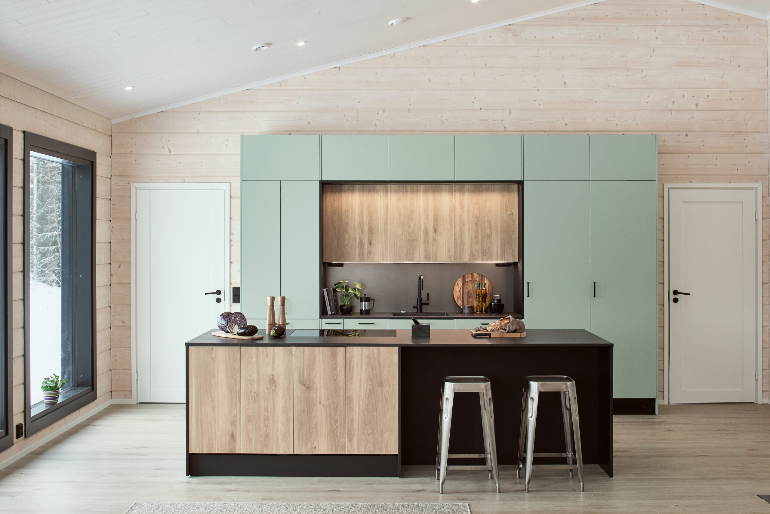 Tähän upeaan hirsitalon keittiöön on valikoitunut vihertävä Kosketus ja puukuvioinen Aitta hunajatammi. Yhdessä Dekton Sirius -työtason ja välitilan tumman harjatun alumiinisen alumiinikomposiittilevyn kanssa ne muodostavat näyttävän kokonaisuuden.